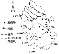 本题解析:1.根据图中等值线的分布判断。农业虫害主要发生于4 800~5 200≥10℃积温等值线之间的区域。所以本题选择C选项。
