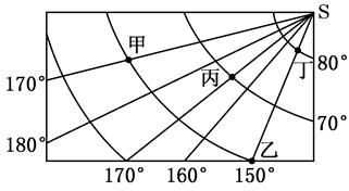 本题解析:第(1)题南极地区俯视图上可以看到地球自转方向为顺时针,故图中甲为西经度,其它三个点的经度都为东经度,甲乙丙丁四地的纬度都是南纬度,由此可以得出甲丙的地理坐标分别是(60°S,170°W) (70°S,170°E)。第(2)题根据经纬网图上方向头判的方法可以判定出丙位于甲的西南方向,甲乙处在同一纬线上,球面上两点之间最短距离是过这两点大圆劣弧长度,先向高纬地方飞,再向低纬飞,所以由甲飞往乙,沿最短路线的航向为先往西南,后往西北。第(3)题丙、丁之间与丙、乙之间的经纬度的跨度是相同的,但乙地的纬度更低,所以丙、丁之间的距离小于丙、乙之间的距离的距离