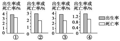 小题1:读图,根据图中的出生率和死亡率判断,①是高高低模式。③的出生率很高,死亡率有所下降,仍是高高低模式,出现在①模式之后。②的出生率、死亡率都比③降低,属于高低高模式。④出生率、死亡率都较低,自然增长率很低,属于低低低模式。所以演变历程正确的是①③②④,B对。