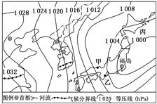小题1:根据海陆轮廓可以判断出日本东部海域有一低压存在。甲、乙两地均位于低压中心西侧,受地转偏向力、水平气压梯度力和摩擦力的共同影响,甲、乙两地均盛行偏西风;甲地等压线不如乙地稠密,故乙地风速大于甲地;图中甲、乙两地均位于冷锋后侧,受单一冷气团控制,低温干燥。