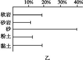 1、综合题 下面的图甲为某滑坡区域坡度、面积频率分布图,图乙为该滑坡区域土质分布图。读图,回答下列问题