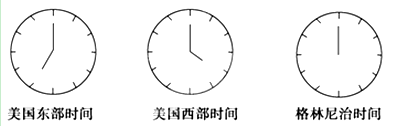 【小题3】到达美国后,酒店大堂悬挂着三个大钟(如下图所示),这时北京时间可能为:( )