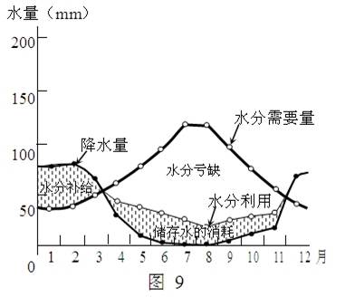 小题1:从图中可以看出,该地在4-11月降水少,但水分需要量大,水分亏缺大,水分利用主要消耗的是储存谁,而11-3月降水多,水分需求量少,水分储存。表明该地有“雨热不同期”的特点,因此可以判断该地为地中海气候。