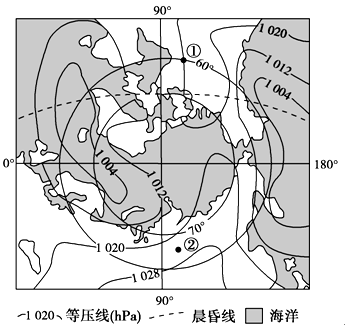 【小题2】北半球海洋上主要受低气压控制,说明此时为冬季,且70°N及其以北为极夜,从冬至到春风,极夜范围从66°34′N到90°N,说明极夜范围每月移动8°左右,此时70°N及其以北为极夜,说明在一月,故选A。