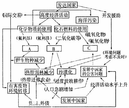 4、综合题 全球环境问题相互联系和相互制约,使人类面临的各种环境问题构成了一个复杂的环境问题群,图中A、B、C代表的环境问题在整个环境问题群中占有极其重要的位置,因而被认为是三大全球性环境问题。读图回答下列问题。(10分)