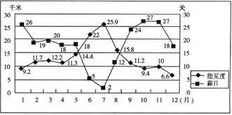 小题2:该题可结合排除法分析,图示反映2007年11月至12月南京的灰霾日下降,A错误;而南京位于我国长江流域不属于我国冬季燃煤取暖的省区,B错误;而汽车尾气的排放量在各个月份应大致相当,故D项错误;而多阴雨天气,则大气能见度下降,C项正确。