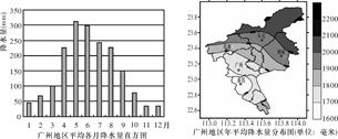 3、单选题 第16 届亚运会于2010 年11 月在广州举行,读“广州地区平均各月降水量直方图”和“广州地区年平均降水量分布图”,回答下列各题。