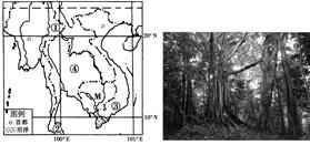 小题2:乙图中的植被茂盛,以高大的乔木为主,最有可能是热带雨林,根据所学的有关东南亚的气候与自然带的相关知识可知,图中只有②地为热带雨林气候,植被为热带雨林。而①地、③地、④地的气候都是热带季风气候,③地的植被为热带季雨林,④地、①地所在的自然带是热带草原带。故选B