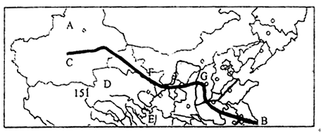 (1)“西气东输”主干管道西起轮南油气田,它位于图中A所表示的????????????自治区,东到B表示的?????????????;C处的 ????????????盆地、D处青海省的???????????????盆地、 E处川渝地区的????????盆地与陕甘宁等地的天然气田,为“西气东输”提供了丰富的气源。