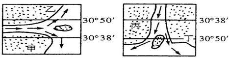 本题解析:试题分析:根据图示的纬度分布判断,甲乙位于北半球,故地转偏向力向右偏,故水流都向右偏即甲岸偏,即甲岸冲刷严重;而泥沙淤积于乙岸;丙丁位于南半球,故地转偏向力向左偏,故水流都向左偏即丁岸偏,即丁岸冲刷严重;而泥沙淤积于丙岸。