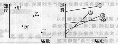 1.左图中速度最快的甲应为航空;运量最大的丁应表示海运;乙运量较大,速度较快表示铁路,故丙表示公路。右图中,①运费最高,为航空;②近距离运费最低,判断为公路;③中短距离运费较低,判断为铁路,④远距离运费最低,判断为海运。