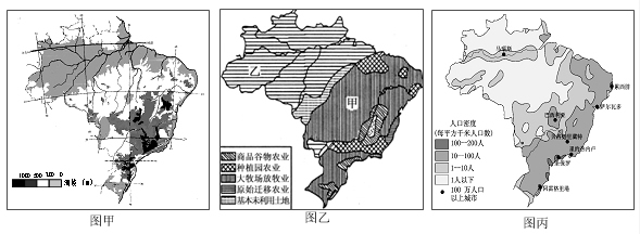 1.结合图示,可知甲位于巴西高原上且人口分布稀疏,地广人稀;同时该区为热带季风气候,干湿季分明,雨水丰富有利于牧草的生长。所以该区适宜发展大牧场放牧业。