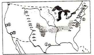 1.图中a、b、c、d、e区域中,属于商品谷物农业地域类型的是2.图示①~⑤城市中,处于地中海气候区的是