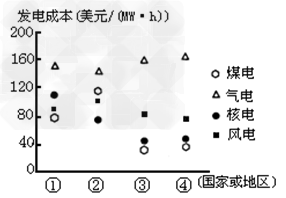 4、单选题 读“2015年中国、印度、美国和欧盟不同能源发电成本预测数据图”,回答1—2题。