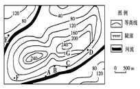 【小题1】根据河流的位置可以判断该处的地形应为山谷,根据等高线的凸出方向和河流流向相反的原则可知:B点所在的等高线较A处高,所以乘索道上行方向为从A向B方向,据指向标可知,上行的方向应为正北方向,所以本题A正确。