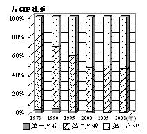 4、单选题 我国某地区2008年人均GDP突破1万美元,图示为该地区产业结构变化过程,读图完成下列各题。
