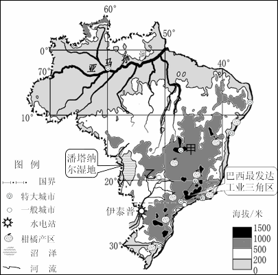 本题解析:本题考查巴西。(1)由于两城市位于南半球,故图示反映降水量主要集中在夏季;图示资料反映乙城市的气温较甲城市高,但乙城市的纬度较甲城市低,故主要从地形对气温的影响分析。(2)水电站开发的有利条件主要从水能资源(流量、落差)、当地的交通等基础设施、生态环境、市场距离等方面分析(注意没有优势的条件不分析)。(3)结合材料主要反映其生物多样性的功能。且由于位于热带草原地区,降水的季节变化大,故该湿地还能起到调节河流径流量的作用。(4)结合图5巴西柑橘的种植地区,故橙汁加工适宜分布在巴西东南部地区,接近原料产区,且靠近东南部经济发达地区,市场广阔,且交通便利,利于出口。(5)巴西的能源利用结构中生物能和水能属于可再生能源。提高生物能比重主要为了减少矿物燃料的燃烧,利于改善能源消费结构,利于减轻大气污染。(6)从乙城市向北至亚马逊河口大致沿经线跨纬度20°,故计算时间为20*111KM/1110KM/h,乙城市所在巴西高原为热带草原带;亚马逊河口为热带雨林带。