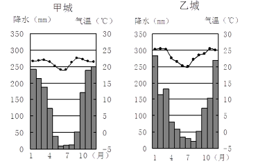 (1)阅读资料一、二,归纳甲、乙两城市降水的共同特征,对比两城市气温的差异并分析原因。