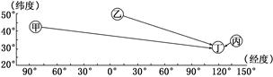 本题解析:小题1:根据图示四地经纬度位置,可以看出甲、乙、丙分别是美国、西欧和日本的汽车工业向中国长三角地区的转移,其主要原因是中国拥有广阔的市场。