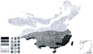 本题解析:试题分析:小题1:结合图例信息,可知该自然资源空间分布大致是从东南向西北递减,再结合四个选项,我国太阳能资源最丰富的地区是青藏高原和西北内陆地区,风能资源丰富的是东南沿海和西北内陆地区,森林资源主要分布在东北和西南横断山区,所以可以推测出该自然资源是水资源。