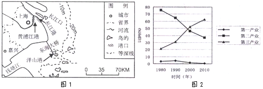 4、综合题 读下列材料和图1"长三角地区局部图"、图2"上海三次产业结构变化图",结合所学知识回答下列问题。