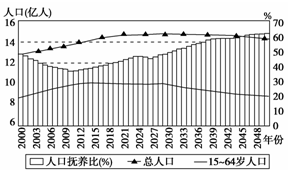 2、单选题 根据《2007年国家人口发展战略研究报告》,我国自20世纪80年代以来生育率下降导致人口抚养比下降1/3,为经济增长创造了40年左右的“人口红利”期。读我国人口抚养比变化示意图,回答下列各题。