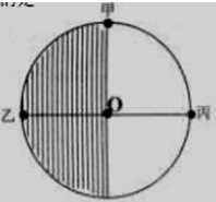 4、单选题  局部昼夜分布图,阴影代表黑夜,中心点O位于75°W,读图完成下列各题。