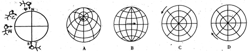 1、单选题 若某人在乙处上空观察,此人所见的经纬网为下图中的( )