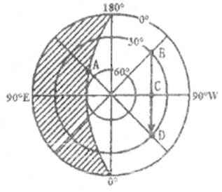3、单选题 下图是以极点为中心的半球图,读图回答下列各题。