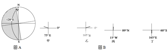 4、单选题 下面图A为“地球某日昼夜情况示意图”,N为北极,S为南极,P为120°E经线和晨线的交点。图B表示四地旗杆的日影(图中短粗线)朝向,读图回答下列各题。