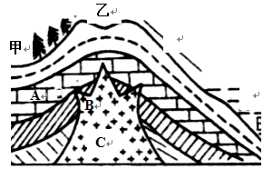 (1) 图中甲、乙两地的地质构造分别是_______和_______,就地表形态来说,乙地是_______,其形成原因是__________________________________________。