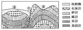 1.图示①处的地质构造为断层,由于断层附近岩石破碎,故易遭侵蚀而形成河谷。2.图中有岩浆活动形成的花岗岩,变质作用形成的大理岩,堆积作用形成的岩层④,故不能确定是否发生了水平拉伸作用。
