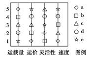 3、单选题 如图是“5种交通运输方式的对比图”。1至5表示从最高到最低的五个等级,a至e表示五种不同的运输方式。读图回答问题。