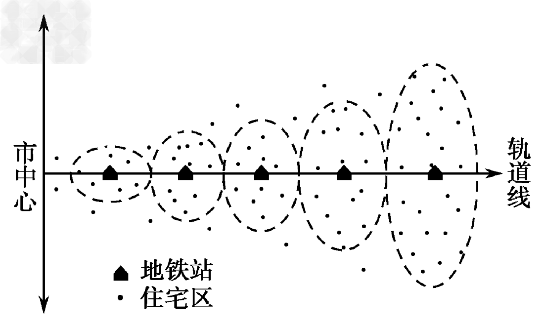 4、单选题 为了缓解图示特大城市交通运输压力,该城市大力发展城市轨道交通,下图为该城某中学地理兴趣小组通过考查绘制的“城市轨道交通(地铁)对住宅空间分布影响示意图”。据此可知由市中心向外,轨道交通