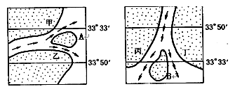 本题解析:本题考查地转偏向力。结合图示的纬度变化判断:甲乙所在为南半球,地转偏向力向左偏,故A岛屿将与乙岸相连;丙丁所在为北半球,地转偏向力向右偏,故B岛屿将与丁案连接。