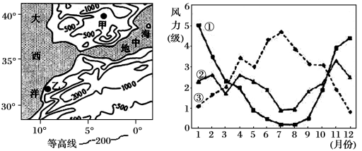 本题解析:试题分析:小题1:甲、乙两地冬季受西风带的影响,风力大,而③曲线夏季风力大,①②曲线冬季风力大,所以甲乙两地应对应①②;又因甲地西侧受高地阻挡,所以冬季风力小于乙地,因此,甲对应②,乙对应①。故选D。