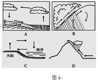 小题2试题分析:从图示中不难发现A B C D分别表示的是海陆间水循环、冷锋、海陆风、地形雨的形成示意。海陆风的形成与海陆热力性质有关,白天陆地增温快,盛行上升气流,近地面形成一个低压中心,海洋上盛行下沉气流,形成一个高压中心,风从海洋吹向陆地(如C图所示)。