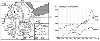 本题解析:试题分析:小题1:据右图可知,甲国出口占国内生产总值的比例在10%左右,比例较低,①正确;根据左图中甲国的经纬度及海陆轮廓可知,该国为非洲的埃塞俄比亚,属于发展中国家,经济发展水平较低,②错;该国人口约8千万,人口较少,劳动力资源不足,且素质较低,③错;该国自然植被以草原为主,主要发展农牧业,由于矿产资源丰富,近年来经济发展速度较快,④正确。
