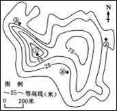 本题解析:试题分析:小题1:图形中点④位置的东北方向是一座山顶,海拔较高,看不到海上日出景观;②、③两点东面都面向海洋,能够较早看到日出;四点中①的海拔最高,东面又无障碍阻挡,所以是最早看到日出的地点,选项A正确。