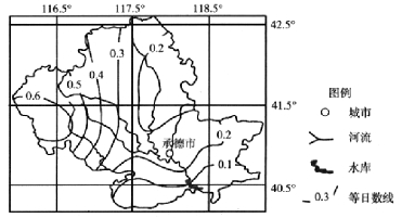 沙尘暴天气及沙漠化严重威胁人类生产生活。承德市位于首都北京与北部最近的沙地浑善达克沙地中间,是沙地扩张南侵的必经之路,因而成为抵御沙尘危害,守卫首都北大门的要塞。下图示意承德市近五十年沙尘暴平均日数空间分布。