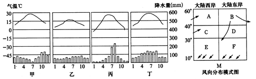 (2)甲.丙两种气候类型在M图中相应的位置分别是 、 。