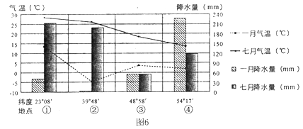 4、单选题 图6为四地气温、降水统计资料,读图完成16—18题。