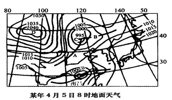 2、综合题 读“某年4月5日8时地面天气”图,回答下列各题:(15分)