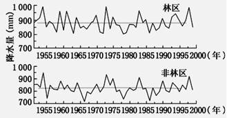5、单选题 读我国林区、非林区年平均降水量变化图,回答问题。