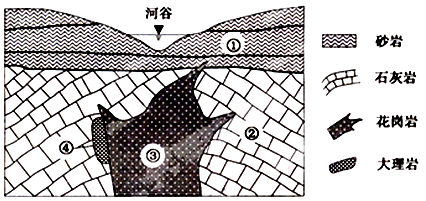 【小题2】化石只存在于沉积岩,①砂岩、②石灰岩为沉积岩有化石,③花岗岩为侵入型岩浆岩、④大理岩为变质岩不会有化石,A正确。