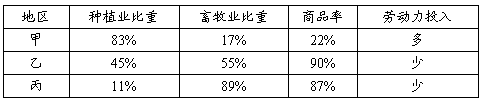 4、单选题 对比甲、乙、丙三个地区农业生产基本特征,回答1—3题。