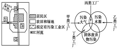 5、单选题 图为某工业城市工业发展规划图,计划在图中四个区位布局四种不同污染类型的工厂。据此完成问题。