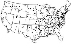 1、单选题 下图是“美国本土某种工业生产厂的分布图”,读图并结合所学地理原理完成下列问题。