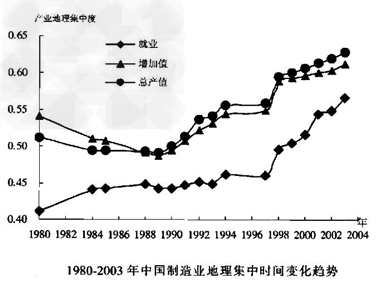 2、单选题 读1980-2003 年中国制造业地理集中时间变化趋势图,完成1-2 题