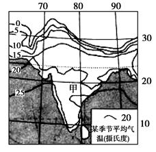 【小题2】据图可知:陆地等温线向低纬凸出,因此此时是北半球的冬季,印度昼短夜长且纬度越高昼越短夜越长;该国冬季受东北季风影响,来自内陆,降水较少;此时太阳直射在南半球,该国正午太阳高度角较小,所以本题C正确。